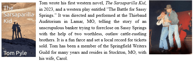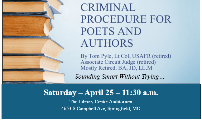 Lt. Col. USAFR (retired), Thomas Pyle, will be presenting Criminal Procedure for Poets and Authors. Pyle served overseas in Germany, Spain, Korea, Japan, and Cuba with the United States Air Force. He has received numerous awards, including AFMC Reserve JAG of the year and the Defense Meritorious Service Medal. He is a graduate of the University of Denver LL.M, University of Missouri, JD, MSU, BA – Economics, and Defense Language Institute–Korea; Air War College; Air Command & Staff College. After retiring from the USAFR, he served as an Associate Judge in Cedar County, MO.